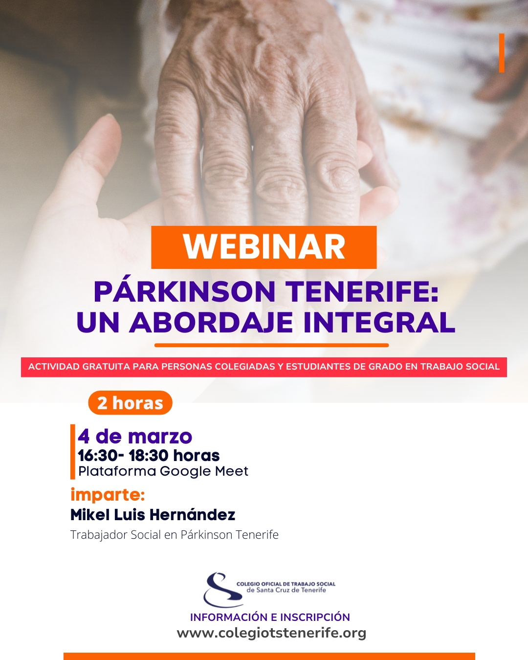 El Colegio Oficial de Trabajo Social de Santa Cruz de Tenerife organiza la Webinar - "Párkinson Tenerife: un abordaje integral", cuyo objetivo es facilitar un acercamiento a la realidad de la enfermedad de Párkinson, y proporcionar información acerca de cómo se aborda de forma integral desde una entidad del Tercer Sector. A su vez, se profundizará en el acompañamiento especializado e interdisciplinar, y de forma específica, cómo el Trabajo Social se integra en el proceso de convivencia con una enfermedad neurodegenerativa. Se facilitarán vías de comunicación y coordinación con la entidad.