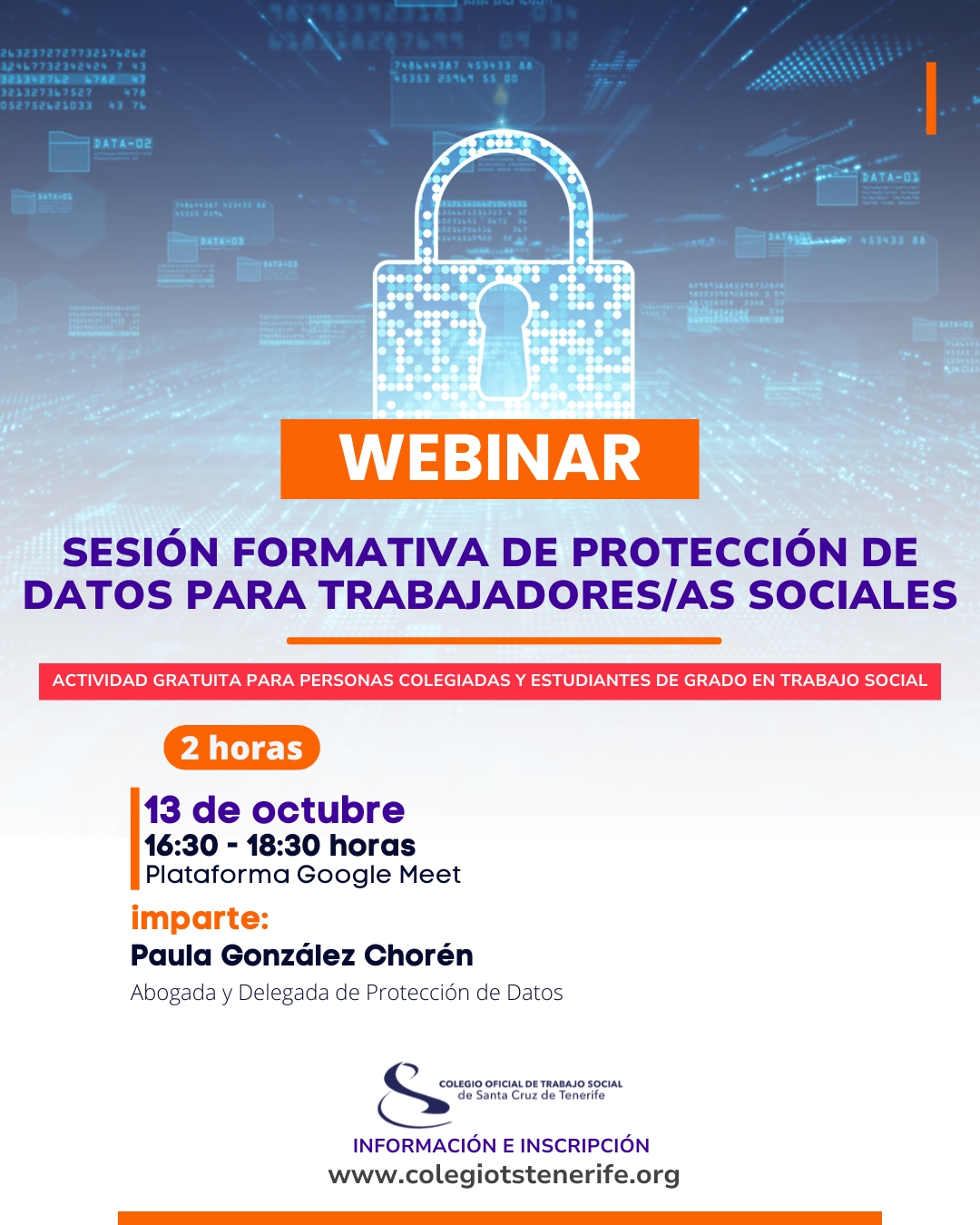 El Colegio Oficial de Trabajo Social de Santa Cruz de Tenerife organiza la Webinar - "Sesión Formativa de Protección de Datos para Trabajadores/as Sociales", que tiene como objetivo principal dar a conocer los aspectos normativos básicos de la normativa en materia de protección de datos, en concreto en el RGPD y en la LOPDGDD así como una serie de contenido práctico enfocado al desarrollo de las labores de los y las trabajadoras sociales en sus puestos de trabajo.